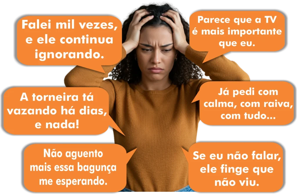 Você já tentou de tudo — conversa, bronca, apelo, pedido doce — e nada mudou. A casa continua do jeito que você não quer, os reparos ficam acumulados, e você fica cansada, frustrada, sozinha nessa luta.